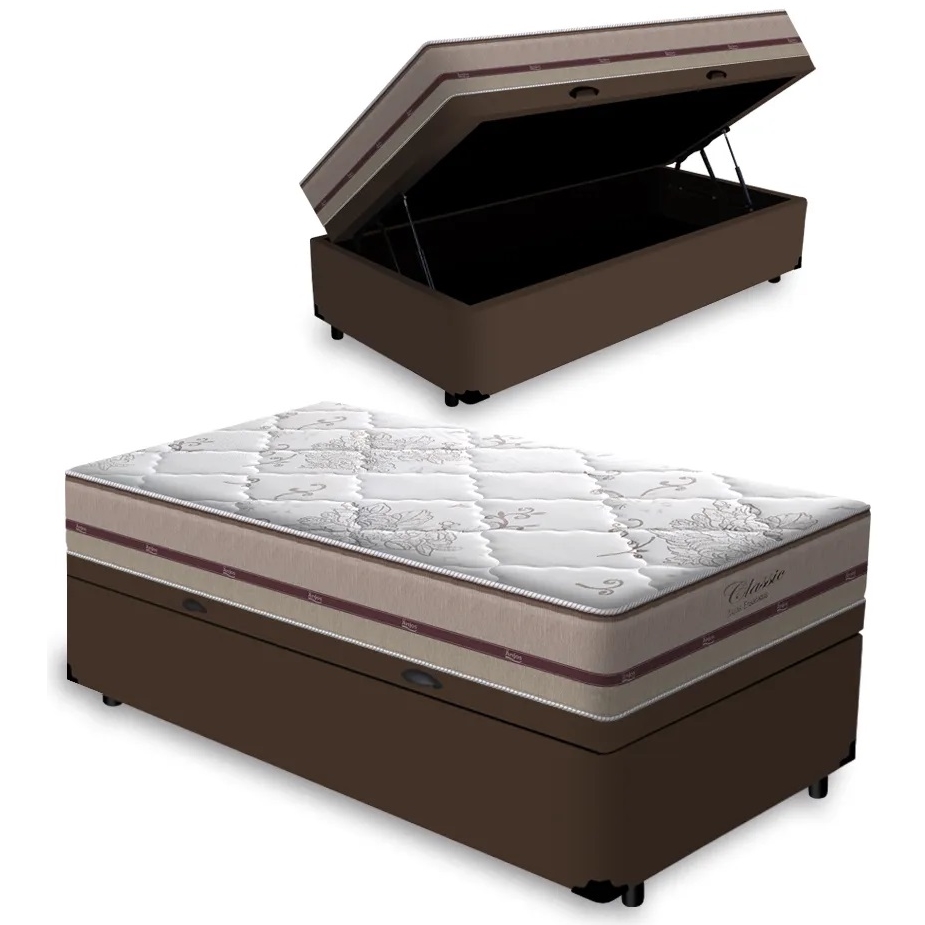 Colchão Solteiro Classic Ensacadas Bege + Base Baú Avalon Marrom – ANJOS + AVALON