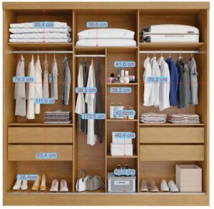 – Prateleiras centrais e espaço para roupas longas