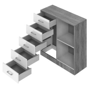 – Cômoda com cinco gavetas com corrediças plásticas e sapateira com prateleira interna