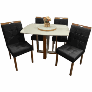 Mesa Atlas Mel/Off White Canto Barril 120×90 com 4 Cadeiras Sophia Mel/Veludo Preto – ART ASSENTOS + WM DECOR