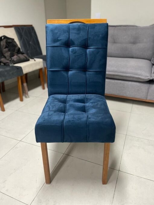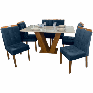 Mesa Classic 160 Cinamomo/Off White com 6 Cadeiras Sophia Mel/Veludo Azul – CEL MÓVEIS + WM DECOR