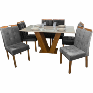 Mesa Classic 160 Cinamomo/Off White com 6 Cadeiras Sophia Mel/Veludo Grafite – CEL MÓVEIS + WM DECOR