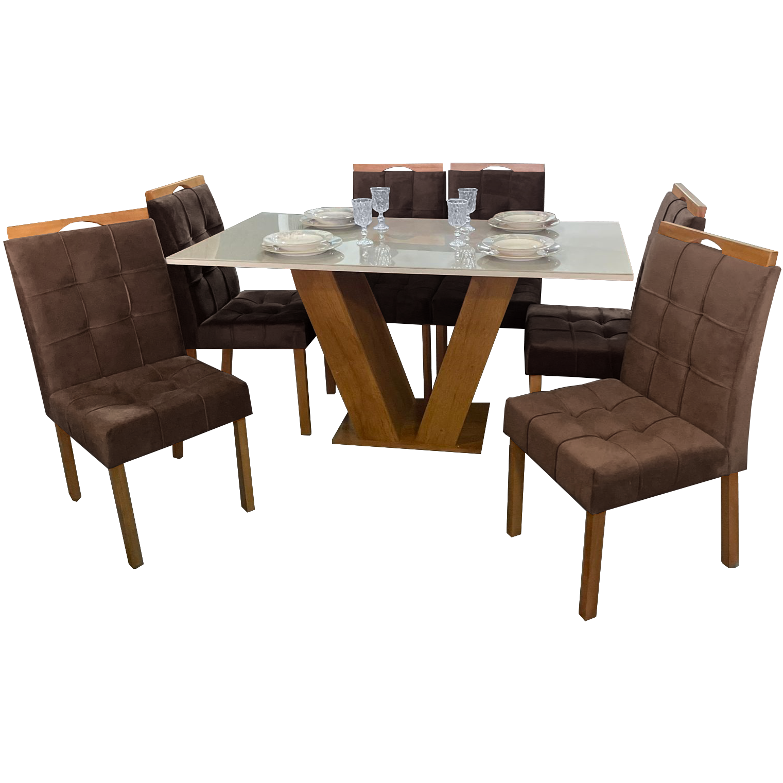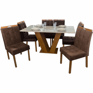 Mesa Classic 160 Cinamomo/Off White com 6 Cadeiras Sophia Mel/Veludo Marrom – CEL MÓVEIS + WM DECOR