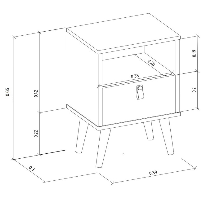 – Gaveta com corrediças telescópicas e puxador de couro sintético