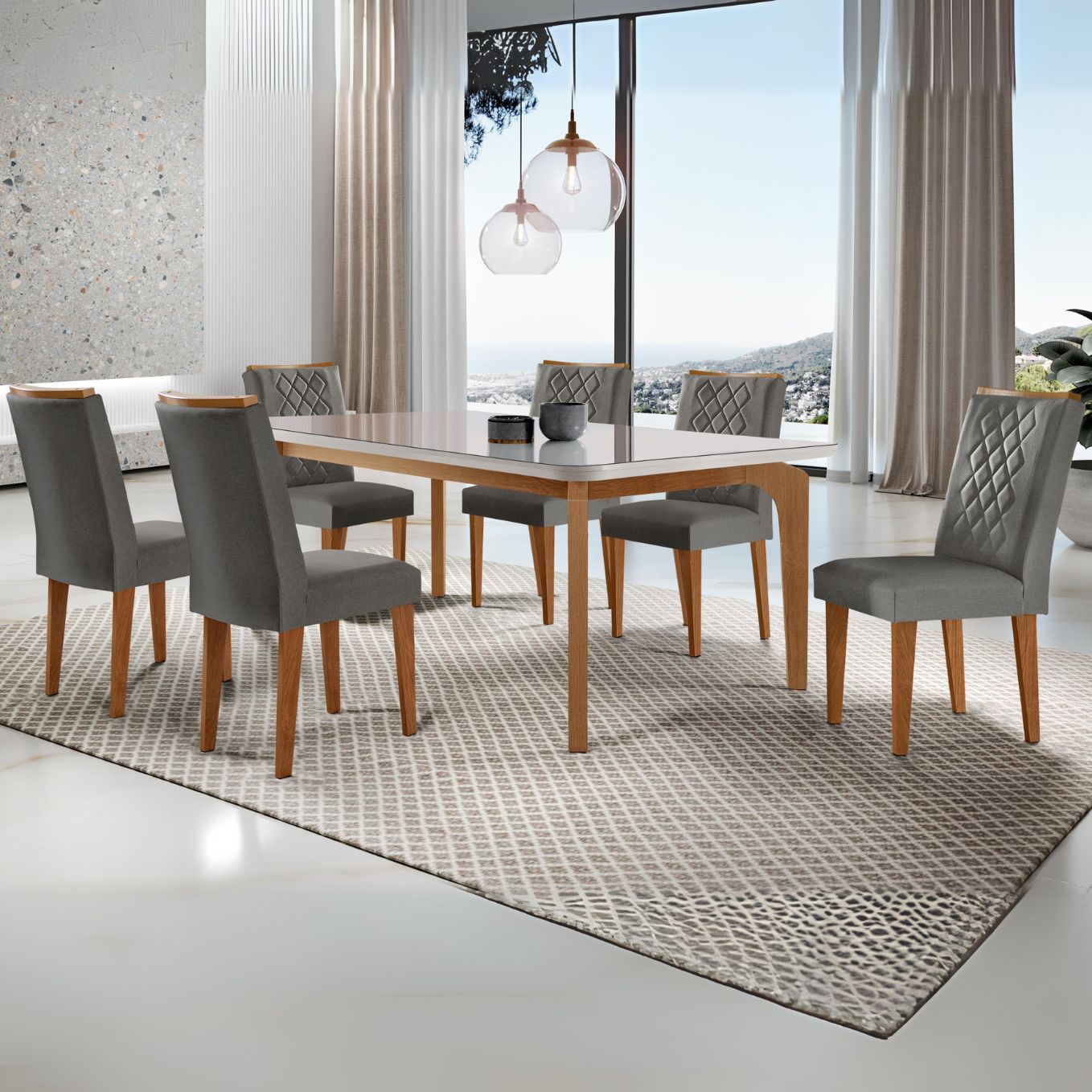 Mesa Londrina 180 Canto Copo Imbuia/Off White com 6 Cadeiras Jade Linho Grafite – RUFATO