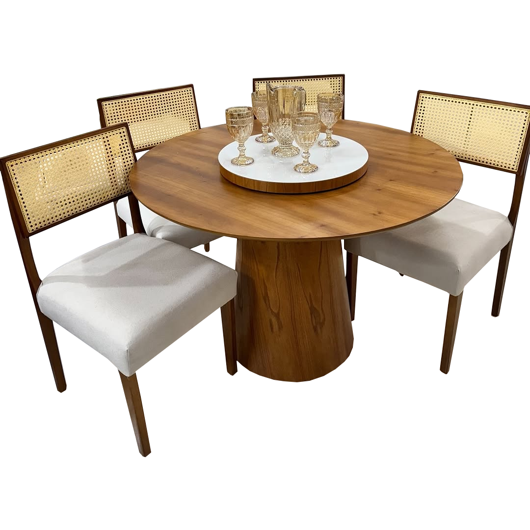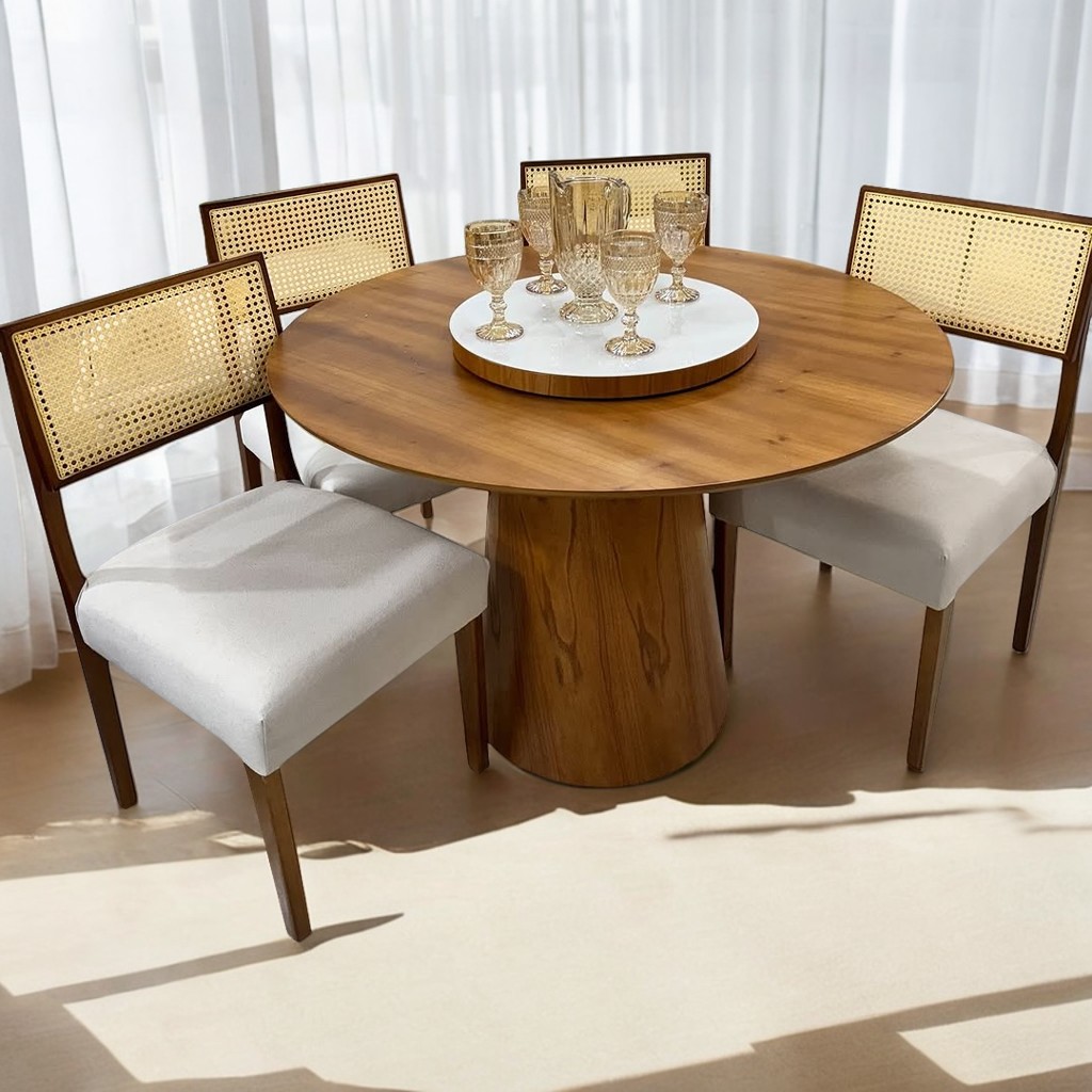 Mesa Redonda Malva 110 Mel + 4 Cadeiras Monalisa Mel/Linho Bege – J SILVA MÓVEIS + AVALON DECOR