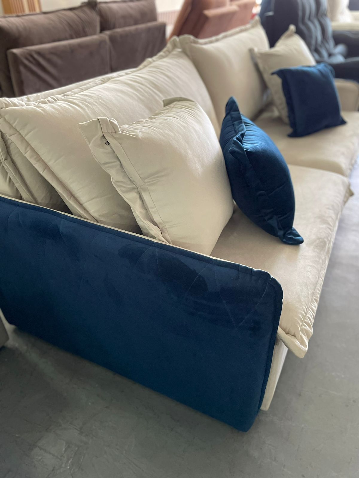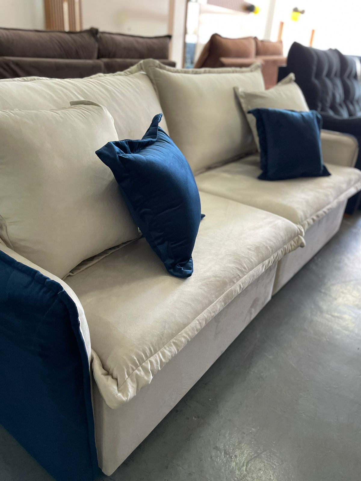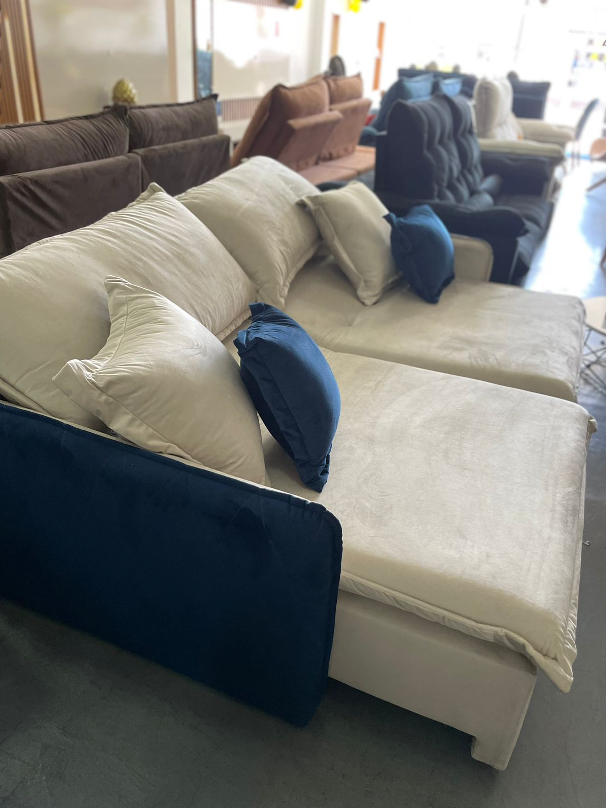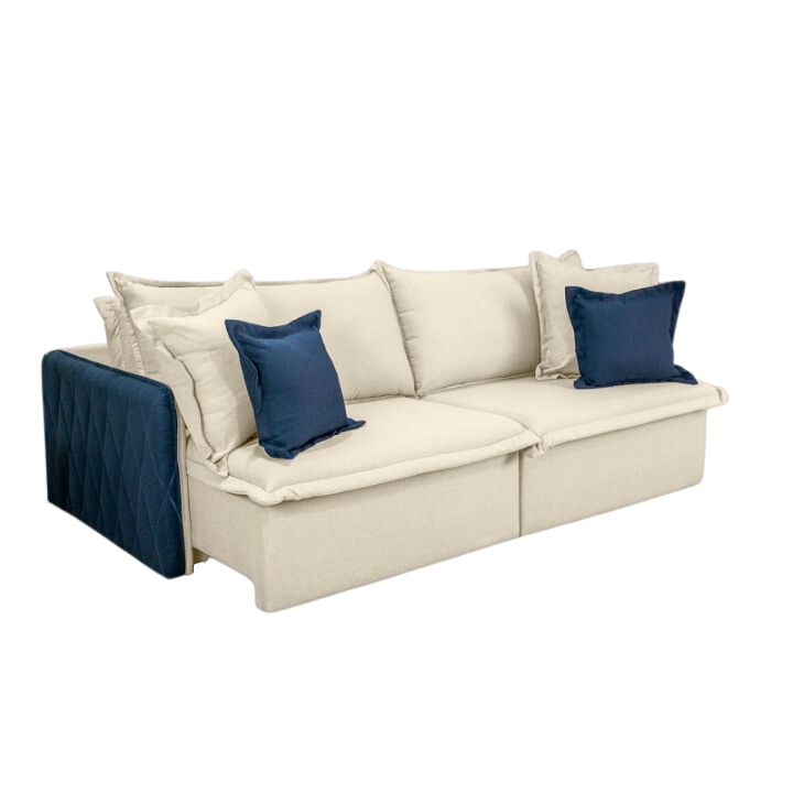 Sofá Cama Retrátil Blog Veludo Marfim/Azul – INNOVE ESTOFADOS